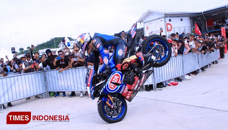 TIMES Minahasa/Pembalap PATA Yamaha Brixx Toprak Razgatlioglu melakukan atraksi stopie ban depan usai memenangi race 1 WSBK Mandalika 2022, Sabtu (12/11/2022). (FOTO: Tria Adha/TIMES Indonesia).