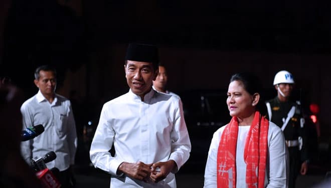 TIMES Minahasa/Capres nomor urut 01 Joko Widodo bersama istri Iriana Joko Widodo tiba di lokasi untuk mengikuti debat Pilpres 2019 putaran kelima, di Hotel Sultan, Jakarta, Sabtu (13/4/2019). (FOTO: Rivan Awal Lingga/Antarafoto)
